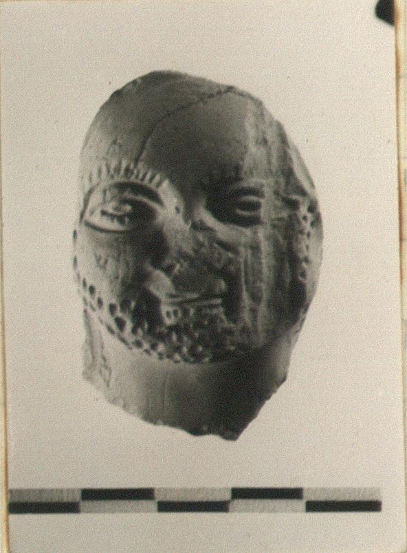 | Description: | Face and neck of bearded man. Beard indicated by minute holes, eyebrows by short strokes. Broken all around; nose missing and gouge down left side of face. No glaze or trace of color. Red-buff clay. | |