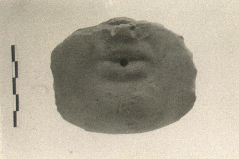 | Description: | Chin and mouth of large face, broken all around. Punched holes for nostrils and between lips, not punched through. Heavy fabric. Slightly micaceous red-brown clay, red at surface. ADDENDA Female, probably tragic mask. | |