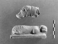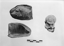 | Description: | Mold for head of dog. Left side. Cut off at shoulders. Complete but cracked. Ear to be added separately. Boldly and well modelled. Fine buff clay. ADDENDA: Back of mold nearly rounded. | |