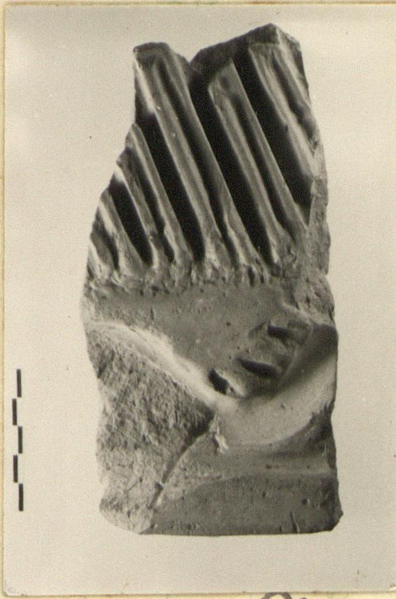 | Description: | Fragment from a mold for a large relief plaque. The oars of a boat and the back and tail of a hippocamp or Triton beneath, to right in the positive. One edge preserved. Cf. T 3120. | |