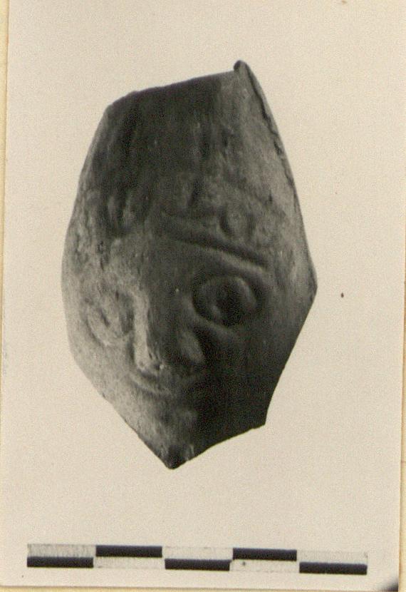 | Description: | Head with pointed cap or hair-dress; scallops of hair above brow. Broken all around. No paint or slip. Hard, brown gritty clay, burned. | |
