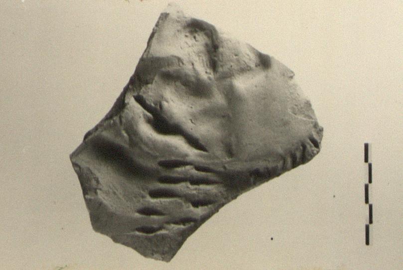 | Description: | Mold for plaque, showing a nude bearded male figure (Centaur or Triton?) to left, raising his right arm and holding a stick in his bent left. In front of him rows of protrusions-a mane (?). Back of mold broken away; possibly for architectural decoration. Rather coarse red fabric; lighter surface. | |