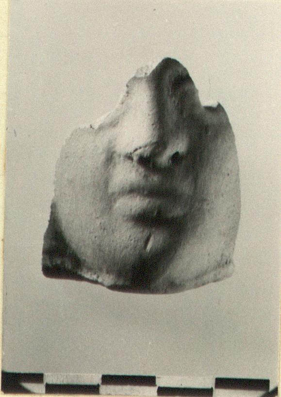 | Description: | Lower part of face preserved. Female tragic mask. Finished edge below chin. Note pierced eyes and nostrils. Traces of orange paint on face, of red on hair, preserved only on lower right side. Brownish-buff clay. | |