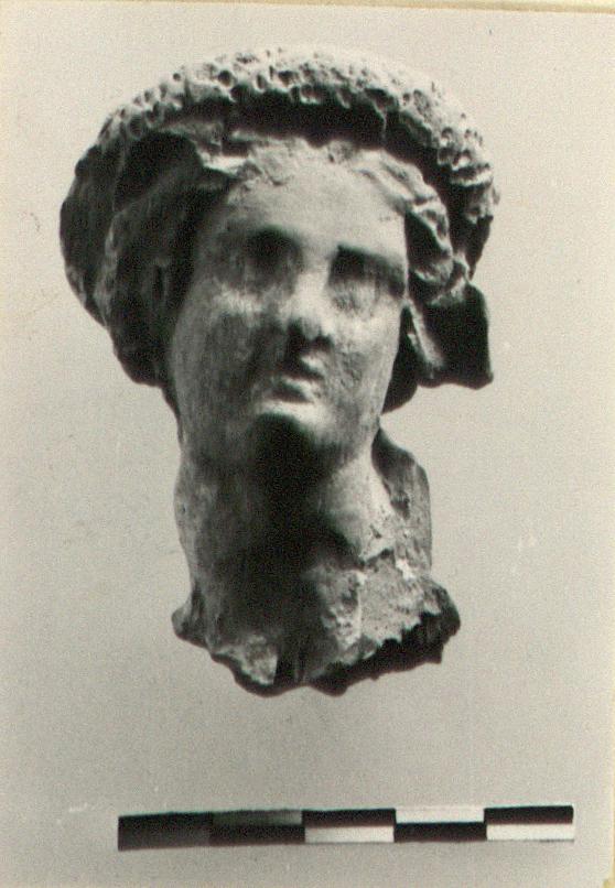 | Description: | Head of a man inclined to proper left; tensed tenon indicated. Long neck. Woven wreath around top of head; ivy leaf hanging over left ear(?). Parts of the hairdressing missing. White slip and traces of ochre over it, preserved on face, neck and little on wreath. Pinkish-buff clay, buff on surface. | |