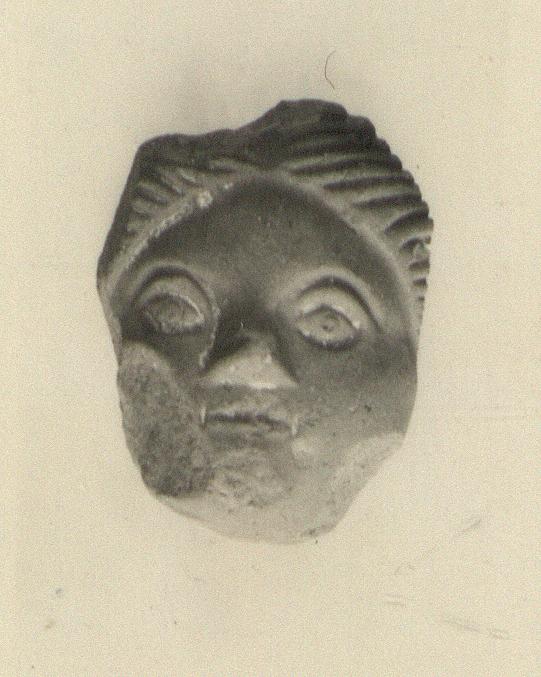 | Description: | Front part of large head. Surface damage round edges, especially right cheek. Fat face with large eyes and short nose. Hair in diagonal grooves. Remains of white paint. Coarse red clay, buff at surface. | |