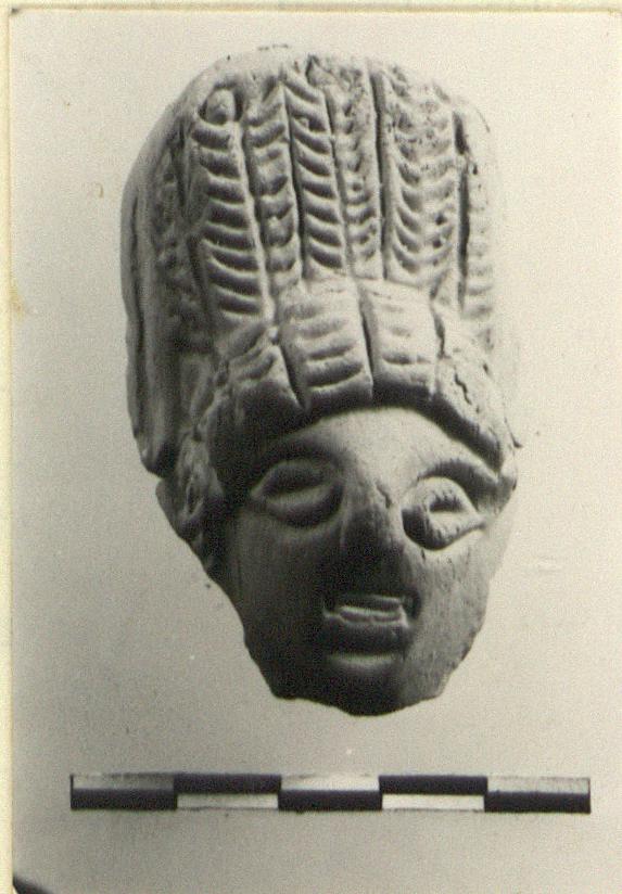 | Description: | Head of a woman in high headdress, gouged features and ornament. Broken in back and below neck. Late Roman. No trace of slip or paint preserved. Hard buff clay. ADDENDA Same mold as T 1351. | |