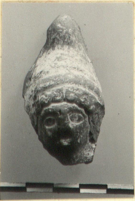 | Description: | Figure in pointed hood or cap; curly hair. Broken away in back and below neck. Traces of white slip. Red clay. ADDENDA Same mold as T 1106. | |