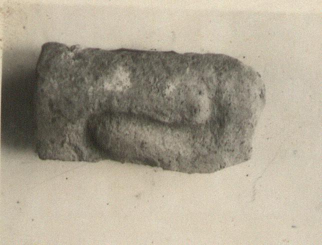 | Description: | Fragment of mold with portion of snake (?) or animal tail (?). Rather coarse pinkish clay with small red and blue bits. | |