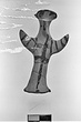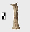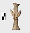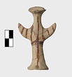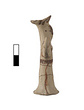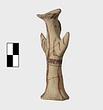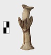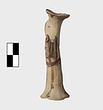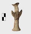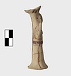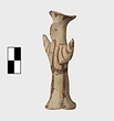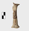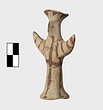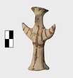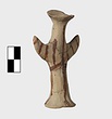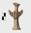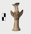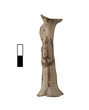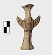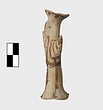 | Description: | Standing female figure; upraised arms covered by wing-sleeves. Flaring headdress, concave on top; shirt flares to form base of figure, concave beneath. Pellet breasts. Mended from several pieces, complete. Stripped decoration in reddish-brown glaze. Buff clay. | |
