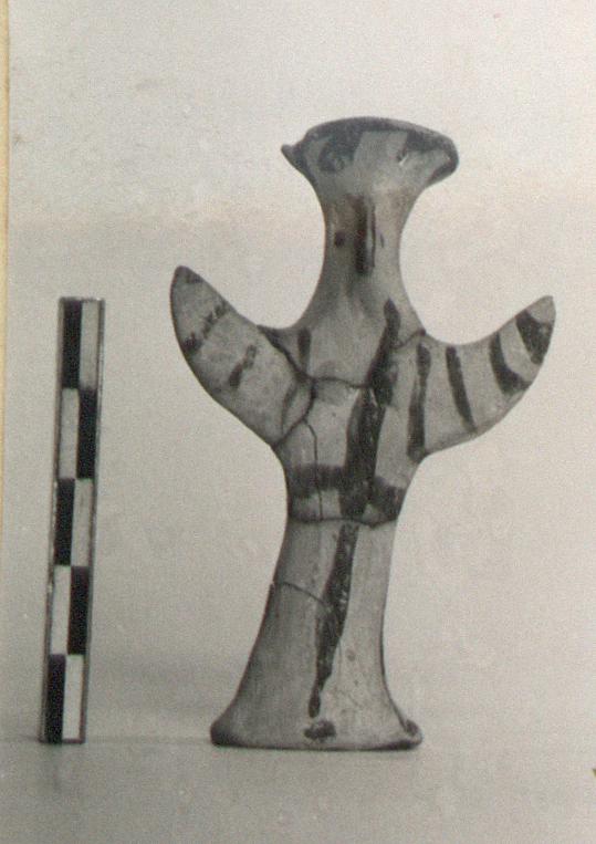| Description: | Standing female figure; upraised arms covered by wing-sleeves. Flaring headdress, concave on top; shirt flares to form base of figure, concave beneath. Pellet breasts. Mended from several pieces, complete. Stripped decoration in reddish-brown glaze. Buff clay. | |