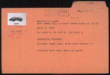 | Description: | Extended right hand, wth heavy cestus (?). Matte red paint. Brownish-buff clay. | |
