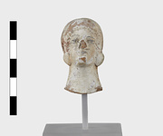 | Description: | Head wearing kerchief and earrings. Nose chipped. Finished surface at bottom of neck for attachment. White paint well preserved. Red on hair at sides and at top. Traces of green on disk earrings. Eyes and eyebrows outlined in black. Brownish-buff clay. | |