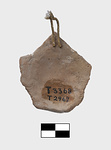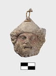 | Description: | Bearded head, wearing a soft cap or a helmet with flaps turned back. The second alternative would explain the breaks at sides where something projected upward. Mouth open with upper teeth indicated. Edges broken at sides and bottom. Two small holes for suspension near top. Color in good condition. Face red; beard and hair golden. Traces of blue on helmet (?) flaps and front band. Eyes white with black pupils and lids. Traces of black line between the curls of beard. Soft brownish-buff clay. | |