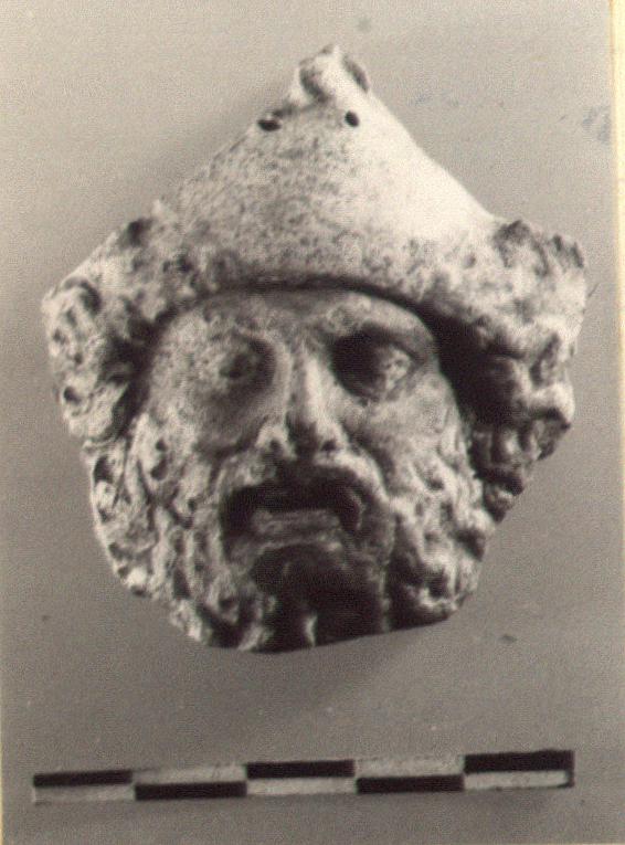 | Description: | Bearded head, wearing a soft cap or a helmet with flaps turned back. The second alternative would explain the breaks at sides where something projected upward. Mouth open with upper teeth indicated. Edges broken at sides and bottom. Two small holes for suspension near top. Color in good condition. Face red; beard and hair golden. Traces of blue on helmet (?) flaps and front band. Eyes white with black pupils and lids. Traces of black line between the curls of beard. Soft brownish-buff clay. | |