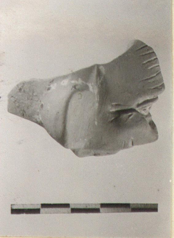 | Description: | Proper right ear and eye and part of forehead and cheek preserved. Large projecting ear. Traces of white slip, and of paint over on the eye and eyebrow. Buff clay. | |