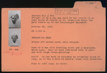 | Description: | Head of a man with beetling brows and a moustache. Mouth open. Hair at back indicated only in part, and with rough cross-grooving. Broken off across neck; chin chipped. Solid. At the back is attached an irregular piece of clay, as if for a sort of handle; stump only preserved. No color. Pink to buff clay. | |