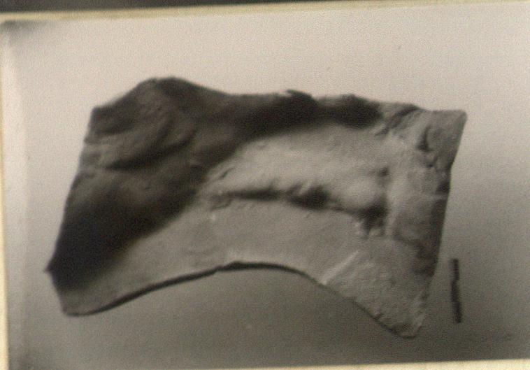 | Description: | Original bottom and concave right edge preserved. Front legs of large bull. For architectural decoration (?). Pinkish-buff clay with red bits in it; light gray surface. | |