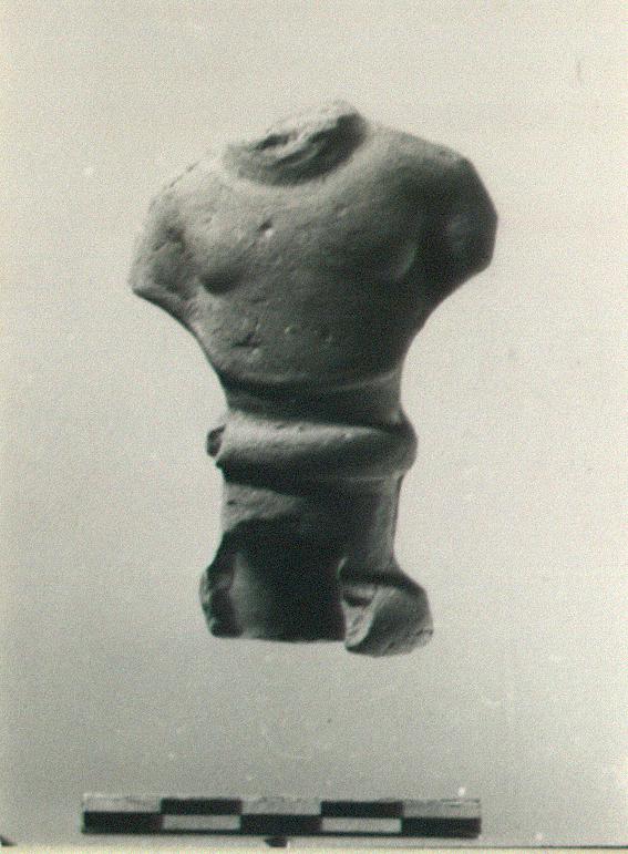| Description: | Male bust (head broken off) and circular pedestal, with collared rim on top, torus molding at bottom. Presence of pellets inside hollow bust suggest use as rattle. Buff surfacing, worn. Soft red clay. | |