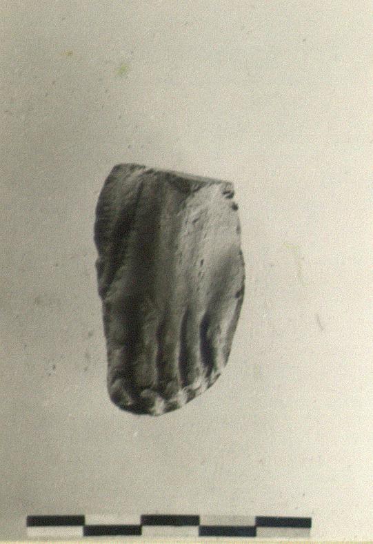 | Description: | Part of mold of left foot for large figure, broken off at ankle. Foot finely modelled, with long toes. Dark red micaceous clay, gray at core as if from burning. ADDENDA C. G: Suggests from metal original. | |