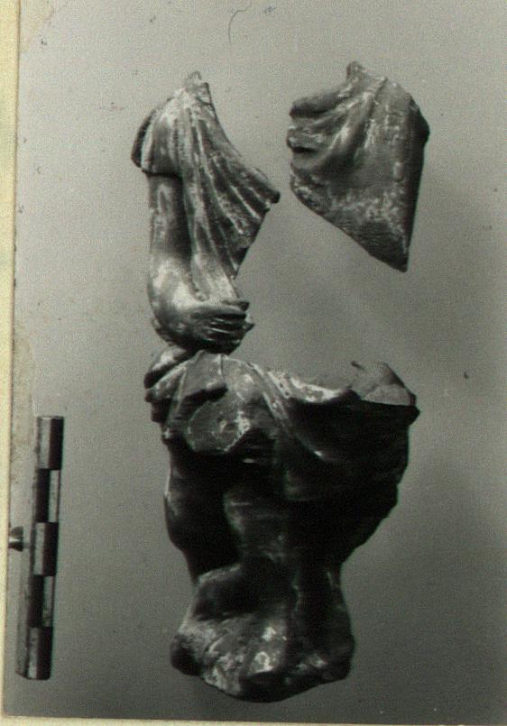 | Description: | Male figure seated on a rock; preserved from right shoulder to bottom; most of left side missing above knee. One non-joining fragment preserves part of drapery at front; another part of the rock, a third uncertain. Right hand rests in lap. Figure wears short full garment reaching to just below knees; and boots (?). Considerable remains of white engobe; and traces of red on boots. Dark pink clay. | |