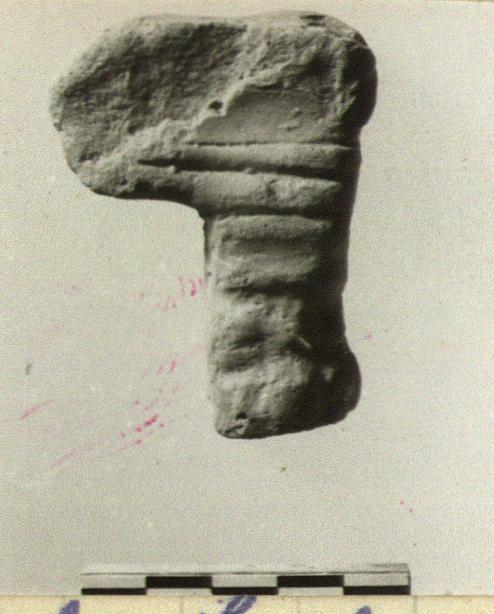 Lion-paw leg with horizontal grooves extending also along cross bar at top. Back of object incised as if for an attachment.