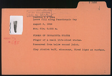 | Description: | Finger of a small life-sized statue. Preserved from below second joint. Pinkish-buff clay, micaceous, fired light at surface. | |