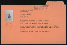 | Description: | Silen in a fur suit, wearing a fillet, sitting cross-legged, drinks from kantharos held in both hands. Remains of white, pink and red paint. | |