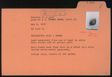 | Description: | Head preserved from top of head to chin; hair broken off at proper left. Hair drawn back from face in a broad roll with narrow mellon-waves (grooved). Traces of red paint. Orange clay. | |