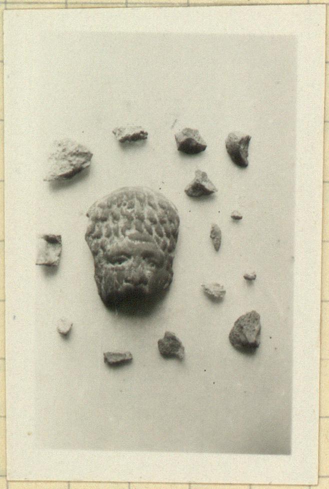 | Description: | Mouth and chin, and the back missing. At the top, part of the finished edge which joined with the back part of the object is preserved. Pierced eyes and nostrils. The hair is drawn straight up from the forehead and indicated by roughly gouged out grooves and ridges. Purplish red wash inside and out. Red clay. From lamp or plastic vase. | |