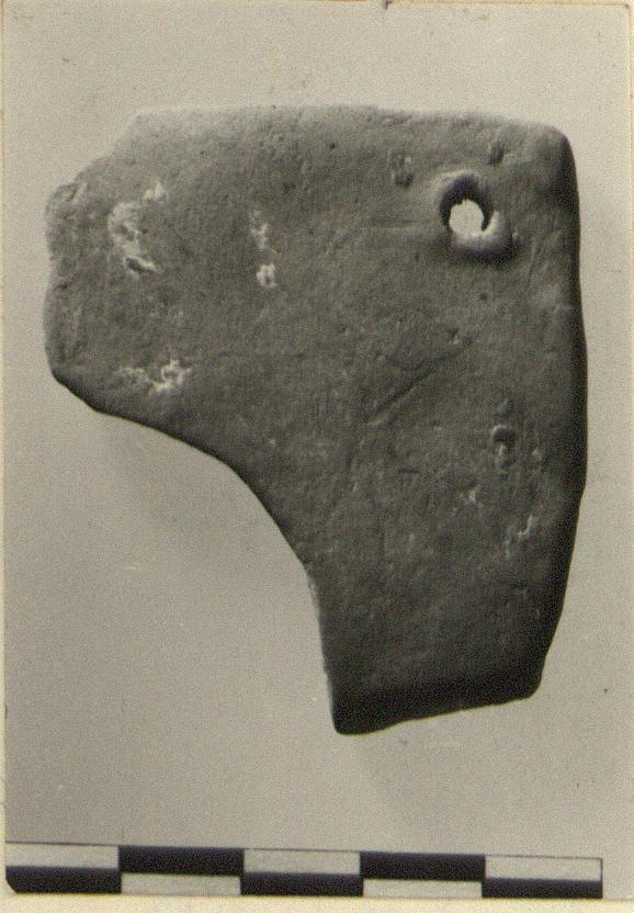 | Description: | Corner of rectangular plaque with hole. Traces of white. | |