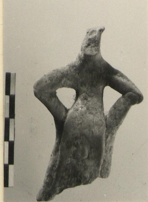 | Description: | Head damaged. Fragments missing from lower left (proper) part. Board type figure sits with arms extended to arms of throne which is supported in the rear by a narrow back and a tripod prop. Long hair. Buff clay. | |