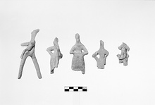 | Description: | Figure sits with arms extended (apparently to arms of throne). Tripod prop and narrow back for throne. Mended from three fragments. All extremities missing. Throne arms and legs broken also. White slip and red color in bands well preserved. ADDENDA Many other examples in box. | |