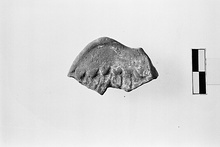 | Description: | Tip broken away. Solid; thin bone accented; modelled feathers. Blond clay. | |