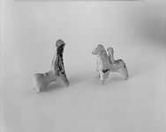 Description:   Rider and head mended to body. Lower legs and all of right hand leg of horses missing. Head of rider is broken off and only stumps of his arms remain. Traces of rider's hands remain grasping horse's neck.