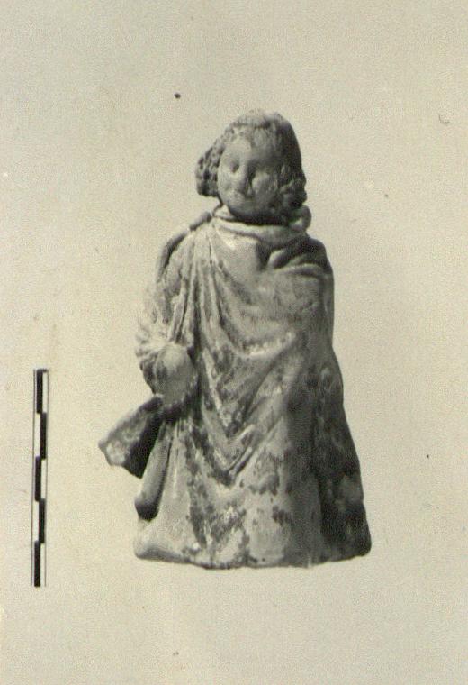 | Description: | Head reattached. Complete except for legs. Similar to T 3806 and from same or related mould. Hatless. Traces of white pigment in drapery. Buff clay. | |