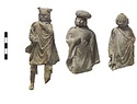 Figure standing with left arm crooked at left side and right arm hanging down at right side. Dressed in clamys fastened with button on right shoulder, wrapped around both arms. Hair in curls hanging nearly to shoulders.