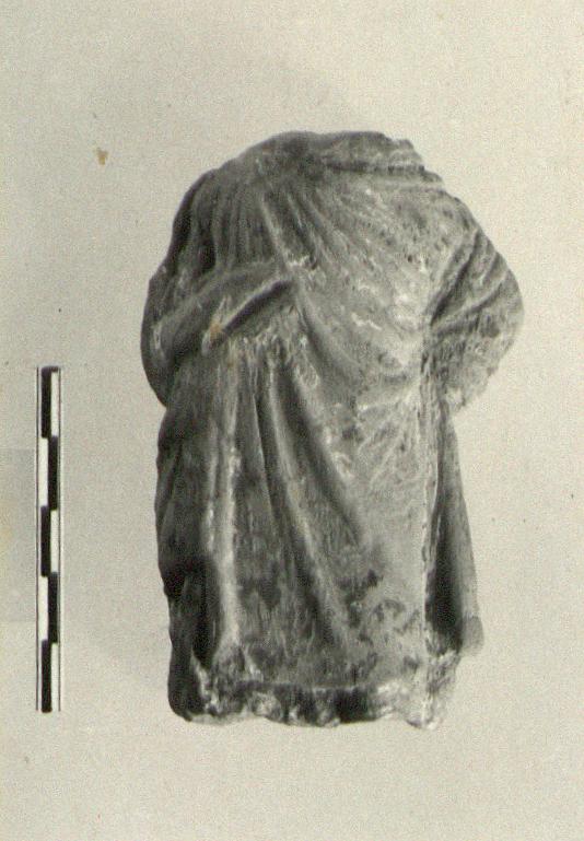 | Description: | Head and legs missing. Moulded head and legs separately. Figure with left arm akimbo and right arm crooked. Dressed in chlamys fastened on right shoulder. Chlamys is wrapped around left arm. Undergarment protrudes beneath chlamys hemline. Left leg advanced. Traces of white paint. Buff clay. | |