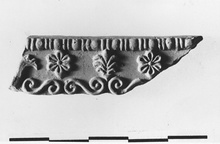 | Description: | Mended from two pieces. Section of an architectural border, very slightly curved. At top bead-and-reel astragal with relief palmettes and rosettes beneath and horizontally laid spiral S-curves at bottom. Excellent crisp relief. Probably from a Tarentine altar. Pinkish-buff clay. | |