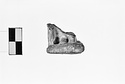 | Description: | Intact with feet of standing figure preserved. Broken above ankles. Rectangular base. Two naked feet, very small, with articulated toes, side by side. Joined to feet at one side is either a post or fold of drapery as support. Perhaps an actor (?). Trace of white paint. Buff clay. | |
