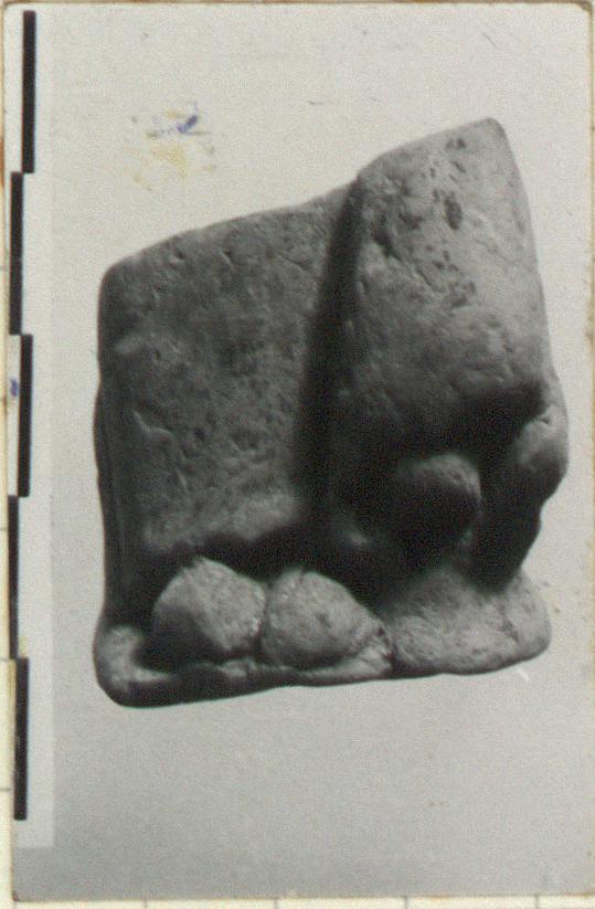| Description: | Preserved is lower part of legs and feet of draped figure. Broken at approximately knee height. Bottom of figure flares slightly to form roughly ovoid standing base. Figure wears long unarticulated garment with an arched curve at feet which are roughly formed. At figure's left is thick projecting fold of drapery, beneath the hem of which other layers appear. Back plain. Crude work. Pinkish-buff clay. | |