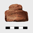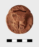 | Description: | Fragment with feet on round base. Mended from two pieces; broken off at the ankles. The feet crudely done, protrude from beneath a solid mass, the legs apparently not being indicated. The high base is hollow beneath. Unglazed. Bright red clay. | |