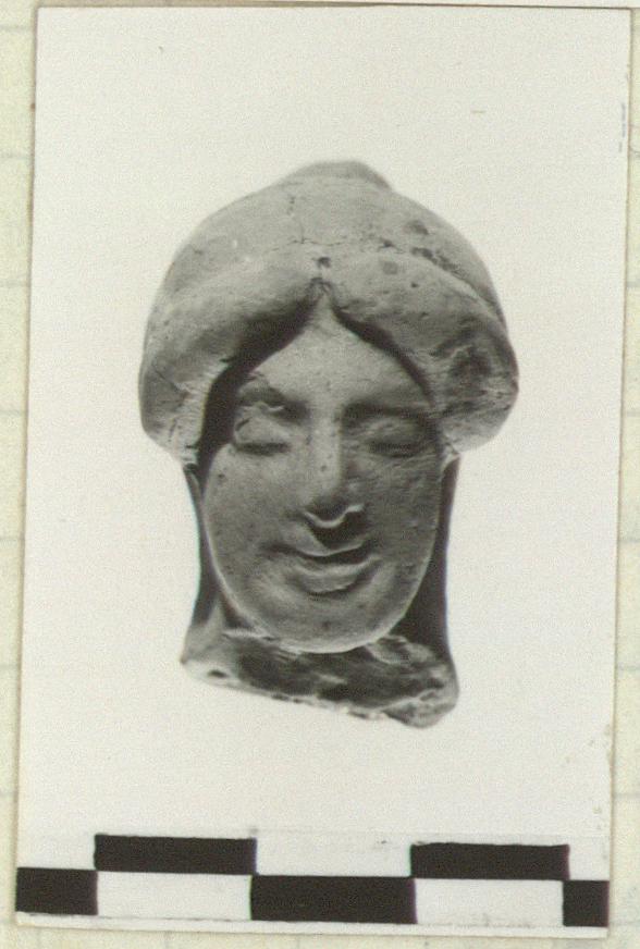 | Description: | Broken at neck. Head of a woman with thick roll of hair, parted in center, over forehead. Hair in a long high bun at back. Slight smile, thick neck. Worn. Orange clay. | |