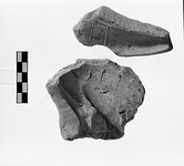 | Description: | One side broken. Front, back and parts of three sides appear to be preserved. Subject unclear. Clear traces of three sides of rectangle can be seen. Possibly represents tail of a winged animal. Back roughly smoothed. Fabric yellowish-pink with slight gray core. Cf. T 4070. | |