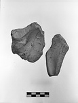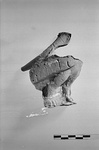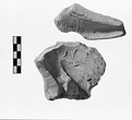 | Description: | One side broken. Front, back and parts of three sides appear to be preserved. Subject unclear. Clear traces of three sides of rectangle can be seen. Possibly represents tail of a winged animal. Back roughly smoothed. Fabric yellowish-pink with slight gray core. Cf. T 4070. | |
