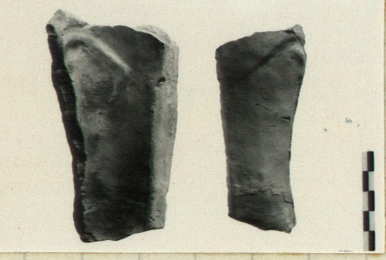 | Description: | Broken on three sides. One side, front and back preserved. Subject uncertain: smooth cylindrical surface wth depressions at both ends. Back smooth. Fabric pinkish-yellow with slight gray core. Cf. T 4099. ADDENDA RVN: A plaque protome of Athena. | |