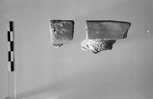 | Description: | Broken on three sides. From group of figurines. Corner preserved of rectangular stand, on which figures were originally placed. Inside smooth. Traces of added white paint. Buff to pink fabric. ADDENDA RVN: Possibly part of the same figure as T 4135. | |