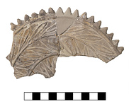 | Description: | Mended and partially restored. About a fifth of the disk preserved. A series of triangles project outward from circumference which is marked by a raised curved ridge. Within there is a wide circular band decorated by a branch with radiating leaves. Center decorated with radiating small and large rays which are separated from band of leaves by a circular raised ridge. Back is fairly flat. Gray to pink fabric. Cf. T 4157, T 4158. ADDENDA RVN: Disk with a garland relief and a "floral star". | |