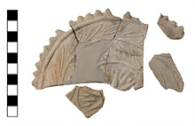 | Description: | About a quarter of disk preserved. One large fragment, partially restored of several joining pieces and three single fragments. Series of radiating triangles along circumference enclosing two raised concentric circles; inner circle forms central circular area decorated by radiating small and large rays. Band between circles decorated with branch and radiating leaves. Fragment a), contains elements of all parts of disk. Fragment b), comes from circumference of radiating triangles. Fragment c), comes from band of leaves. Fragment d), comes from central circle. Back fairly flat. Fabric buff to pink. Cf. T 4156 and T 4158, for similar type of disk. ADDENDA RVN: Probably Attic derivatives from Corinthian. Disk with garland and "floral star". | |