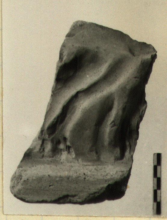 | Description: | Broken at left, right and above. Fragment of a mold for a large plaque, preserving what seems to be two legs of an animal, perhaps a deer. Very coarse yellow clay outside, finer dark buff clay outside, finer dark buff clay within. ADDENDA Sample, thin section: J. Reley, Univ. of Southampton, 5/6/78. | |