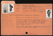 | Description: | Head of woman carrying a basket with offerings. Broken off at the base of the neck. Her hair is parted in the middle from the crown to nape of neck, with a lock falling at either side of the neck. The liknon (?) or basket is supported on a pad, and contains offerings which resemble fruit. Traces of white paint on the face, red on the hair and pad. Pierced in small hole beneath. Pinkish buff clay. ADENDA: Offerings: cake, fruits, wreath. Color: white slip. Pink on face, dark red on hair and pad, orange red on basket, and offerings. Dress probably pale blue (traces at base of neck). | |